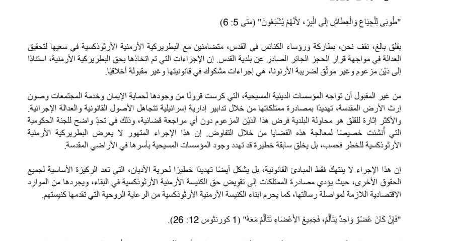 بطاركة روؤساء الكنائس في القدس يدينون الحجز الجائر على ممتلكات البطركية الأرمنية