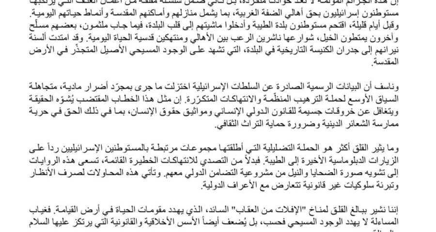 بيان صادر عن بطاركة ورؤساء الكنائس في القدس بما يخص الاعتداءات المتكررة التي تستهدف بلدة الطيبة
