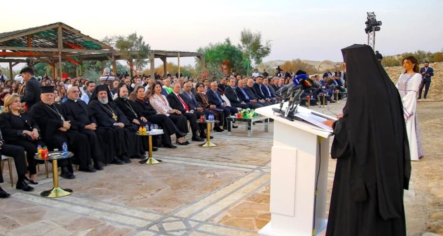وها نحنُ اليومَ وبعد أكثرِ من ألفَي عامٍ للميلادِ نقفُ جميعًا مسيحيّينَ ومسلمينَ في الضّفةِ الشّرقيّةِ لنهرِ الأردنّ مُحتفِلينَ باليوبيلِ الفضّي لموقعِ المغطسِ المقدّسِ والذي تزامَنَ مع اليوبيلِ الفضّي لجلوس جلالة الملك على العرشِ وتسلُّمِهِ سُلُطاتِهِ الدّستوريّة. المكانُ الذي لأوّلِ مرّةٍ في التّاريخِ البشريّ يُسمَعُ صوتُ الآبِ وينزِلُ الرّوحُ القدسُ بهيئةِ حمامة، المكانُ الذي اعتمدَ فيه المسيحُ له المجد بيدِ القدّيسِ يوحنّا المعمدان ، المكانُ الذي فيه تقدَّست طبيعةُ المياهِ بمعموديّةِ المسيحِ فيه، المكانُ الذي تنبعثُ منه رائحةُ الطّيبِ والقداسةِ من خلالِ حياةِ نُسّاكِه ورهبانِه الذين رووا الأرضَ بدموعهِم واستجابتِ السّماءُ لصلواتِهم ،المكانُ الذي تتطلّعُ إليه جميعُ أنظارِ المسيحيّينَ في العالمِ ليغتَرِفوا القداسةَ والبَرَكة ،المكانُ الذي منه انطلقتِ المسيحيّةُ إلى العالمِ أجمع ، لنُضيءَ معًا وسطَ إقليمٍ ملتهبٍ بالحروبِ شجرةَ عيدِ الميلادِ المجيدِ، عيدَ السّلامِ بمثابةِ أملٍ ورجاءٍ لشعوبِنا المتالِّمةِ وتجسيدًا للمحبّةِ والتّآخي ضارعين إلى الإلهِ المتجسّدِ إلهِ السّلامِ في هذه الأيّامِ المبارَكَةِ ونحنُ على أبوابِ الميلادِ المجيدِ بأن يبسُطَ سلامَه العادلَ على الأماكِنِ المقدّسةِ ويُنيرَ ويرشدَ أصحابَ القرارِ لحلِّ القضيّةِ الفلسطينيّةِ وأن يَمُنَّ على أهلِنا في غزةَ ولبنانَ وسوريا بالسّلامِ ويخفِّفَ عنهُمِ الذُّعرَ والخوفَ والألمَ ويشفي كلَّ مريضٍ وجريحٍ فيهِم ويرحمَ مَنِ استشهدَ منهم، ونبتهلُ إليهِ أن يُديمَ علينا وعلى أردنِّنا الغالي نعمةَ الامنِ والأمانِ والسّلامِ ويثبِّتَ المحبّةَ والتّسامحَ بيننا جميعًا ويأزُرَ ويحفظَ لنا جلالة الملك عبدالله الثاني ابن الحسين المعظم وولي عهده الأمين سمو الأمير الحسين بن عبدالله وجيشَنا العربيَّ وأجهزتِنا الأمنيِّةِ ليبقى اسمُ الأردنِّ عاليًا شامخًا حصينًا منيعًا أمام من تُسَوِّلُ له نفسُه العبثَ بسلامِ الأردنِّ واستقرارِه.